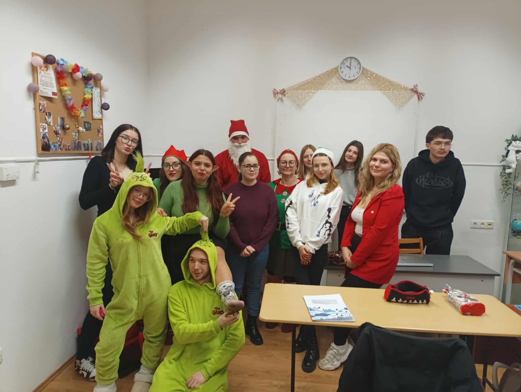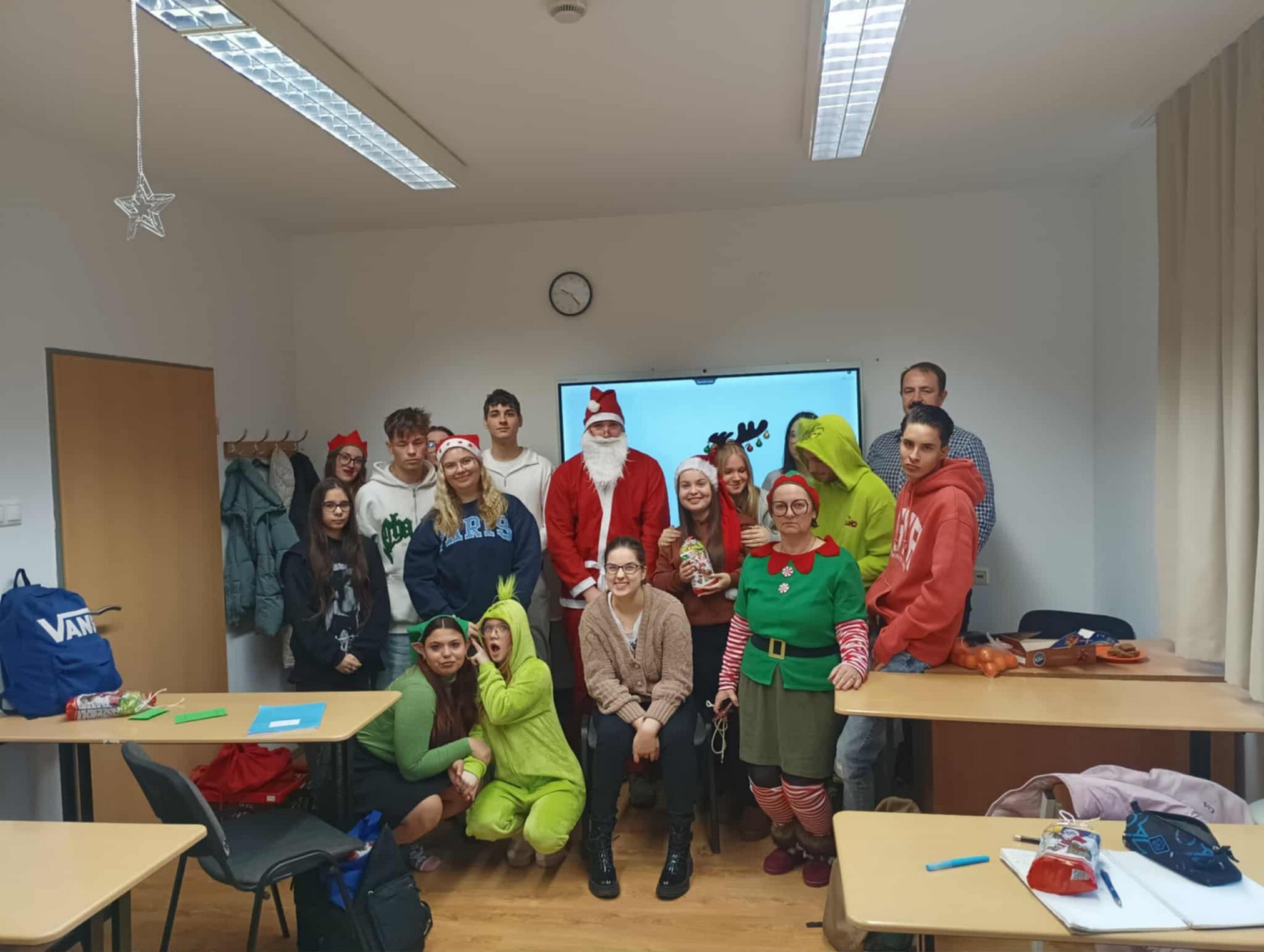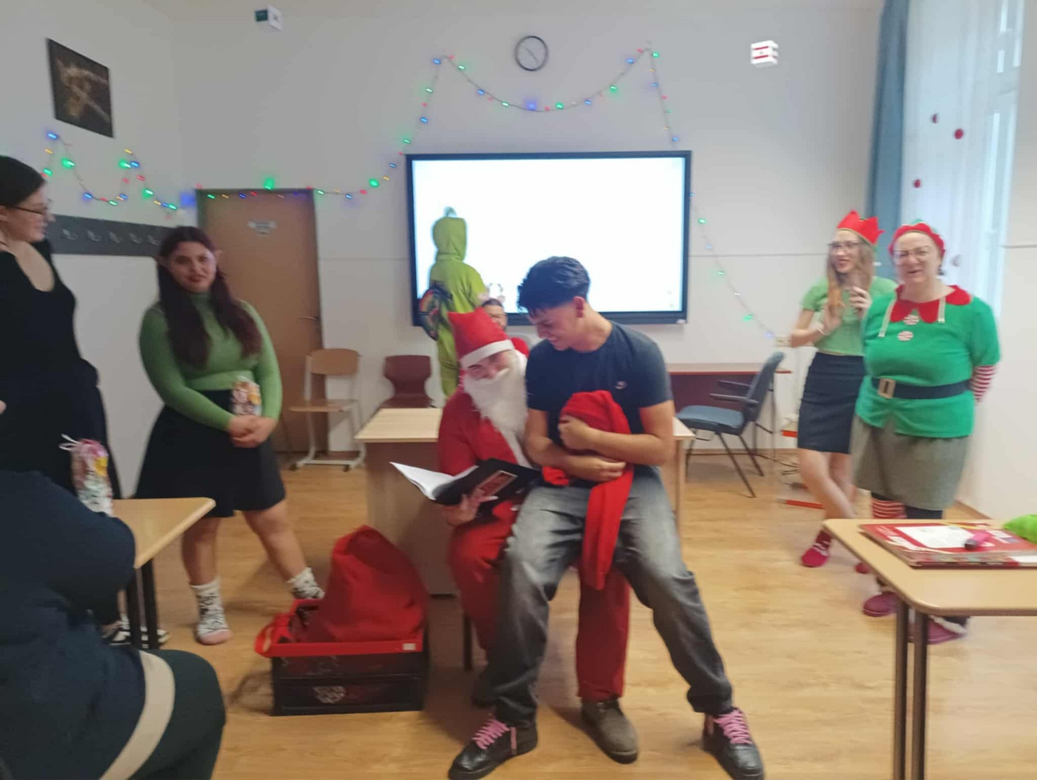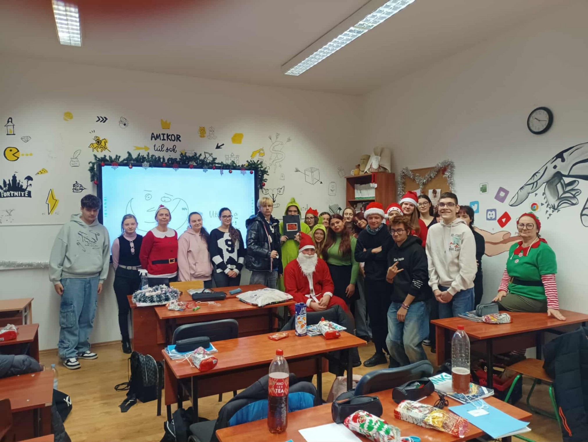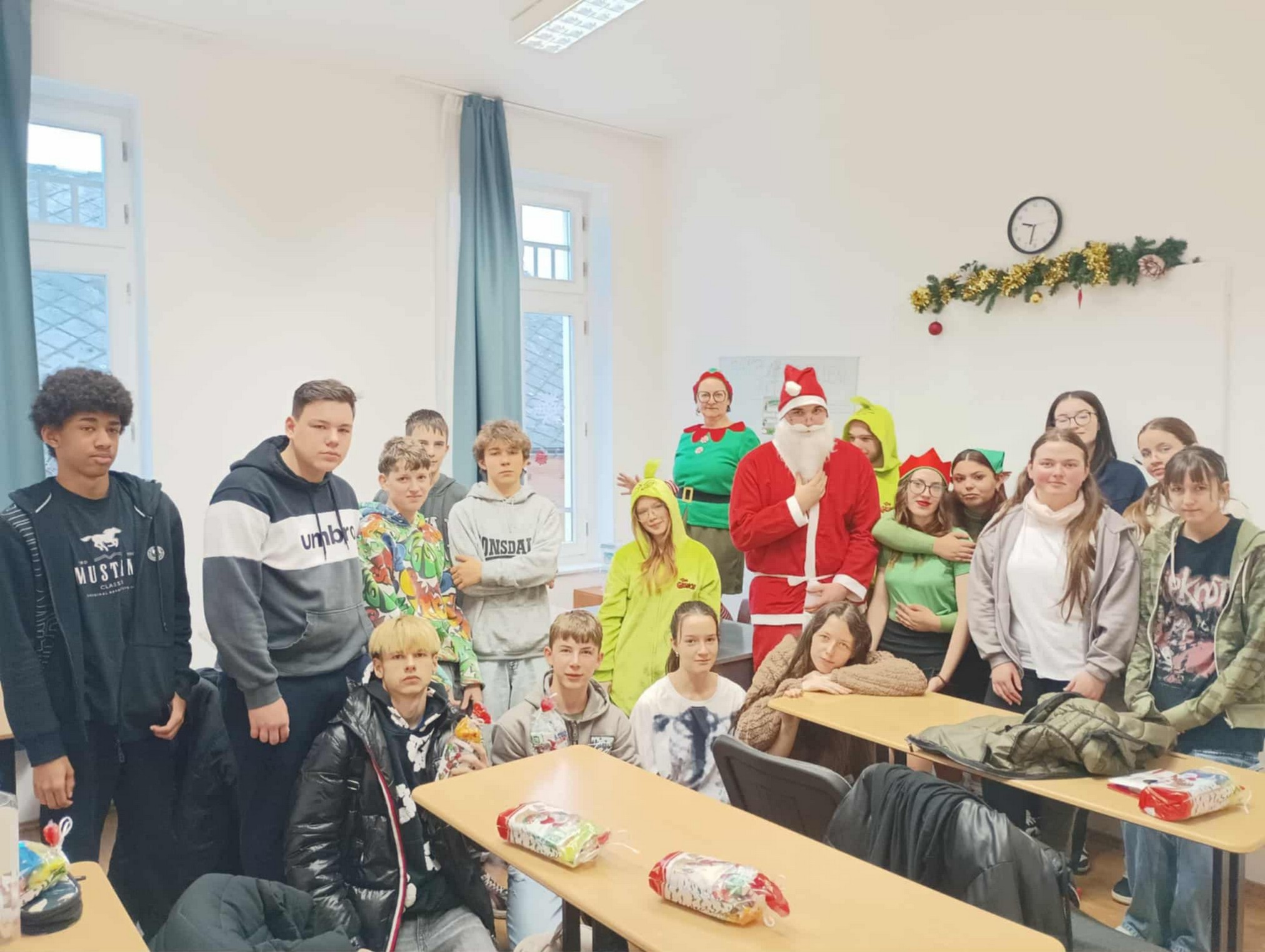 A Mikulást ezúttal sem hagyták magára: vele tartottak a vidám manók, a csintalan grincsek és a mókás krampuszok is, akik folyamatosan gondoskodtak a jókedvről és a nevetésről. A diákok énekszóval csalogatták be a Mikulást, a folyosókat pedig egész nap ünnepi hangulat töltötte be. A tanárok is kivették részüket a mókából – ismét beöltöztek a gyerekekkel együtt, így valódi ünnepi kavalkád fogadta a Mikulást.